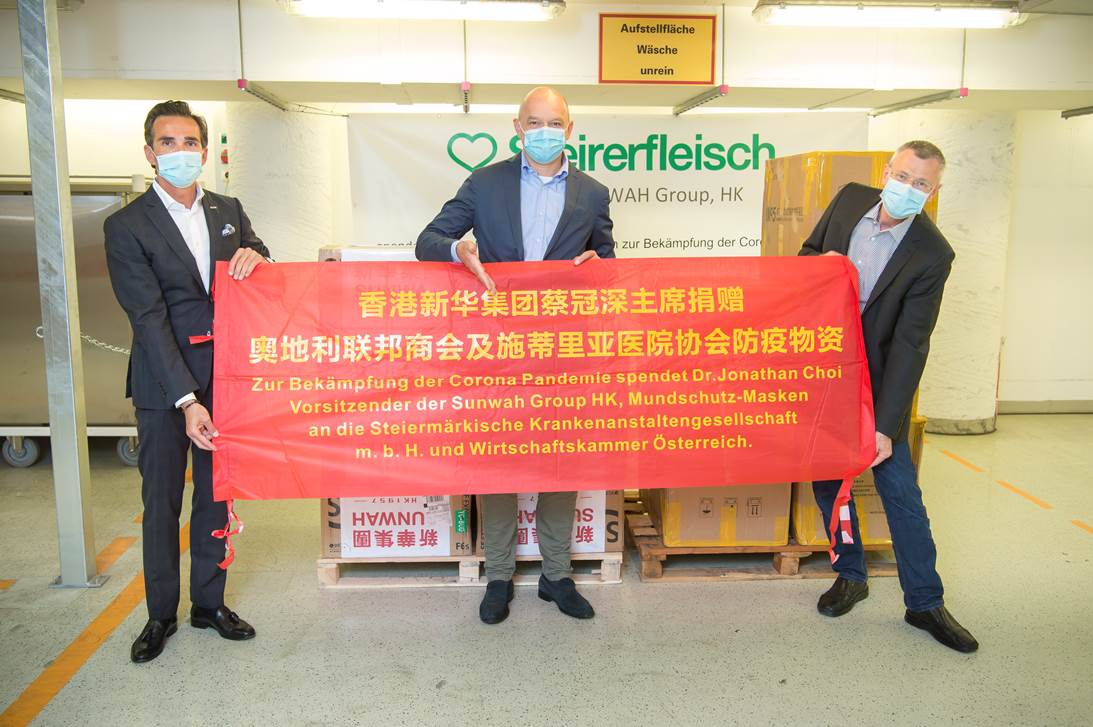 China.com.cn – Recently, Dr Jonathan Choi, Standing Committee Member of the Chinese People’s Political Consultative Conference and Chairman of Sunwah Group, donated 20,000 FFP2 medical masks to support the Austrian Federal Economic Chamber and the Styria Hospital Association. Mr Dietmar Schweiggl, Special Representative of the President of the Austrian Federal Economic Chamber, Chairman of the Austrian Agricultural Trade Commission and Mr Werner Sailer, leader of the Styria Hospital Association, and other representatives of the above-mentioned units received the donation and expressed their sincere thanks to Dr Choi for his beautiful gesture. In addition, the Austrian Federal Economic Chamber also specifically sent a notice to the Austrian Embassy in China about this donation, as well as a thank-you letter to the Chinese Embassy in Austria.