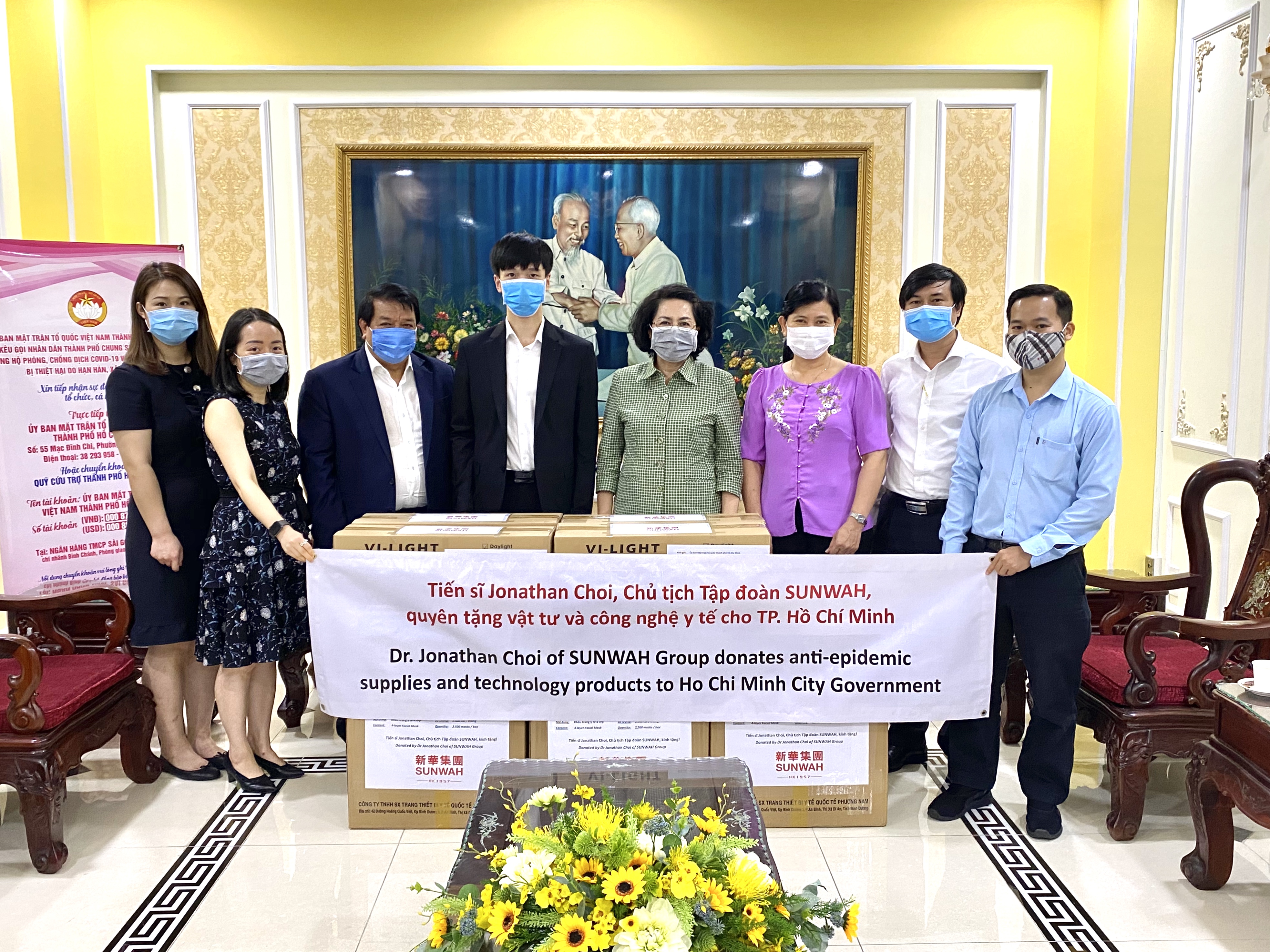 Sunwah – To support Ho Chi Minh City in the fight against COVID-19, Dr. Jonathan Choi, Chairman of Sunwah Group, donated 20,000 medical masks, 2,000 bottles of hand sanitizer, 100 sets of UV germicidal lights and one package of technology products today (9 April) to Ho Chi Minh City government, Vietnam National University, University of Economics and Banking University in Ho Chi Minh City.