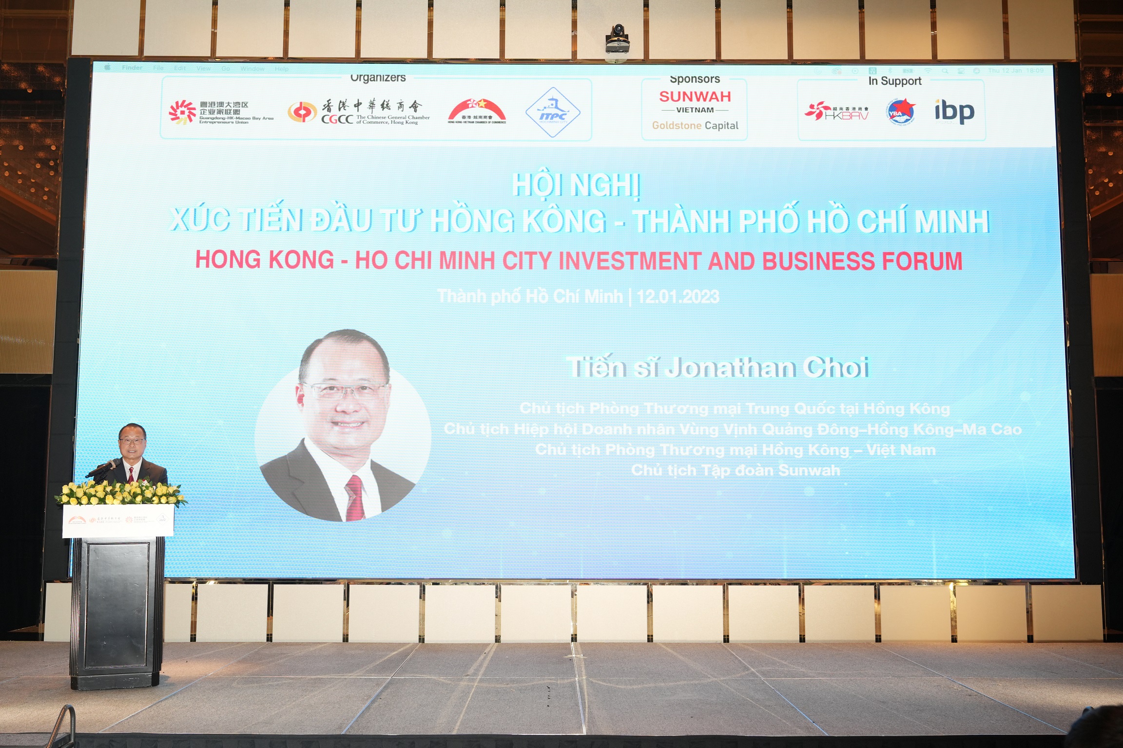 Tiến sĩ Jonathan Choi, Chủ tịch Phòng Thương mại Trung Quốc tại Hồng Kông, Chủ tịch Hiệp hội Doanh nhân Vùng Vịnh Quảng Đông – Hồng Kông – Ma Cao, Chủ tịch Phòng Thương mại Hồng Kông – Việt Nam, và Chủ tịch Tập đoàn Sunwah, chia sẻ trong bài phát biểu khai mạc: “Là một công dân Hồng Kông, tôi đã luôn coi Việt Nam là quê hương thứ hai của mình. Tập đoàn Sunwah đã hoạt động tại Việt Nam từ những năm 1970 và có trụ sở đang được đặt tại TP. Hồ Chí Minh, thành phố năng động nhất Việt Nam. Tôi rất vui được là cầu nối giữa Hồng Kông với Việt Nam, đặc biệt là với TP. Hồ Chí Minh, cũng như đóng góp công sức mang lại lợi ích chung cho hai mái nhà thân yêu của gia đình tôi. Vào tháng 7 năm ngoái, tôi đã đến TP. Hồ Chí Minh và chủ trì sự kiện thúc đẩy quan hệ hợp tác giữa Việt Nam và Hồng Kông. Đó cũng là lần đầu tiên tôi quay lại Việt Nam sau 3 năm đại dịch. Lần này, tôi rất vui được dẫn đầu đoàn đại biểu gồm 60 lãnh đạo doanh nghiệp và chuyên gia trong các lĩnh vực khác nhau từ Hồng Kông sang Việt Nam để tìm hiểu môi trường kinh doanh, đầu tư và tìm kiếm các cơ hội hợp tác. Một số thành viên trong đoàn đã và đang đầu tư tại Việt Nam, và số còn lại thì đang tìm kiếm các cơ hội đầu tư tại Việt Nam. Tôi cũng đặc biệt tin tưởng rằng, họ chắc chắn sẽ đều ấn tượng với sự hấp dẫn, cũng như vô số các cơ hội kinh doanh và đầu tư tiềm năng trên dải đất hình chữ S này.”