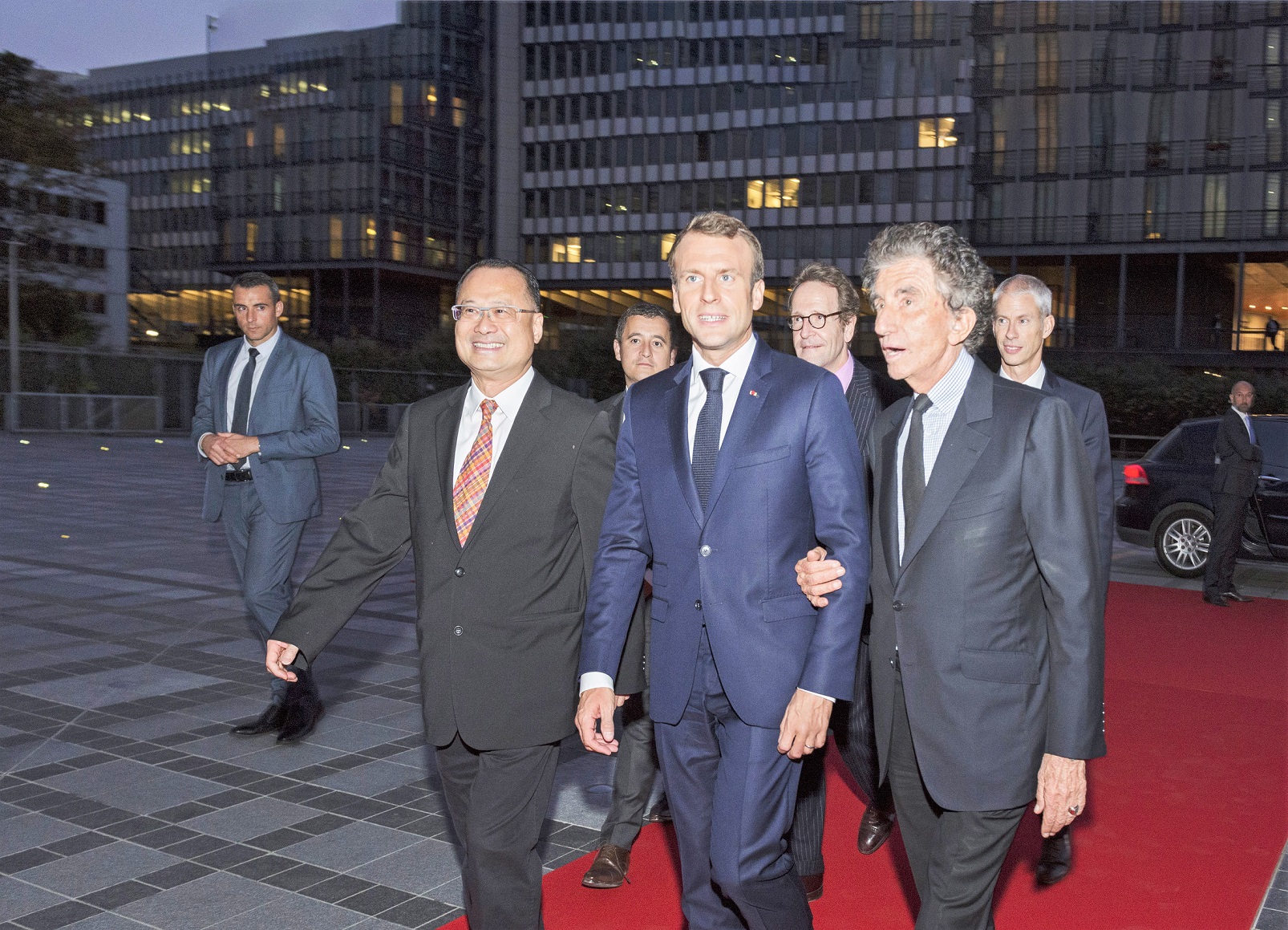 Hàng đầu, từ trái qua phải: Tiến sĩ Jonathan Choi, Chủ tịch Quỹ Jonathan KS Choi; Tổng thống Pháp Emmanuel Macron và ông Jack Lang, nguyên Bộ trưởng Văn hóa và nguyên Bộ trưởng Giáo dục Pháp
