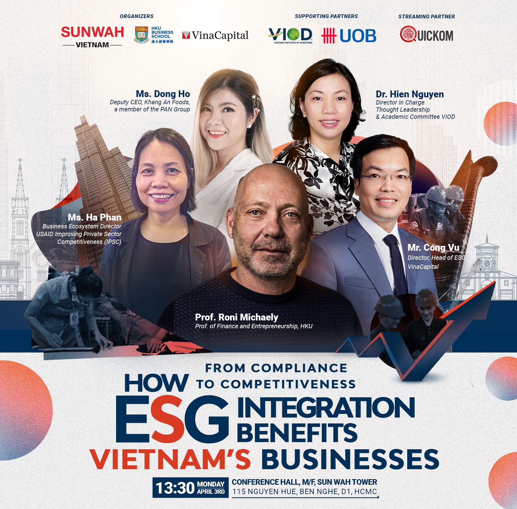 Sunwah – On the afternoon of 3 April 2023, the workshop “From Compliance to Competitiveness: How ESG integration benefits Vietnam’s businesses” was successfully held at Sunwah Convention Center, Ho Chi Minh City, in order to raise awareness of integrating ESG standards in business and operation strategies of Vietnamese enterprises. The workshop was organized by Sunwah Vietnam in collaboration with the Business School of the University of Hong Kong and VinaCapital, and supported by the Vietnam Institute of Directors (VIOD) and United Overseas Bank (UOB) Vietnam, with media partner Quickom.